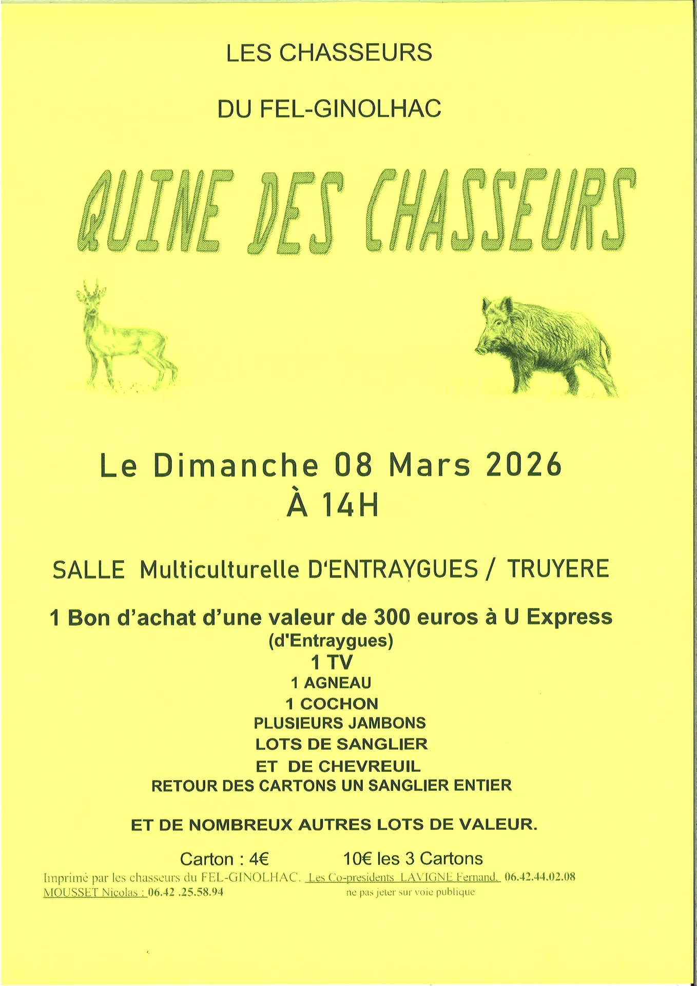 1 bon d’achat d’une valeur de 300€ à U-Express d’Entraygues 1 TV, 1 agneau, 1 cochon plusieurs jambons, lots de sanglier et de chevreuil.