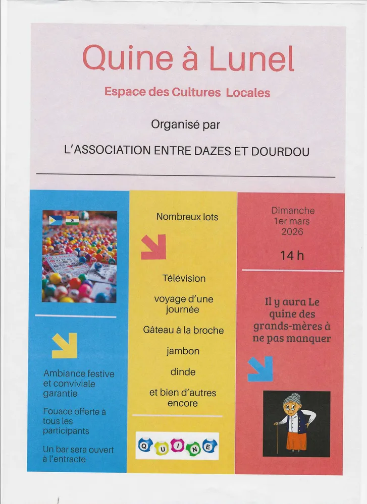 Quine organisé par l’Association entre Dazes et Dourdou le 1er mars à 14h à l’Espace des Cultures Locales.