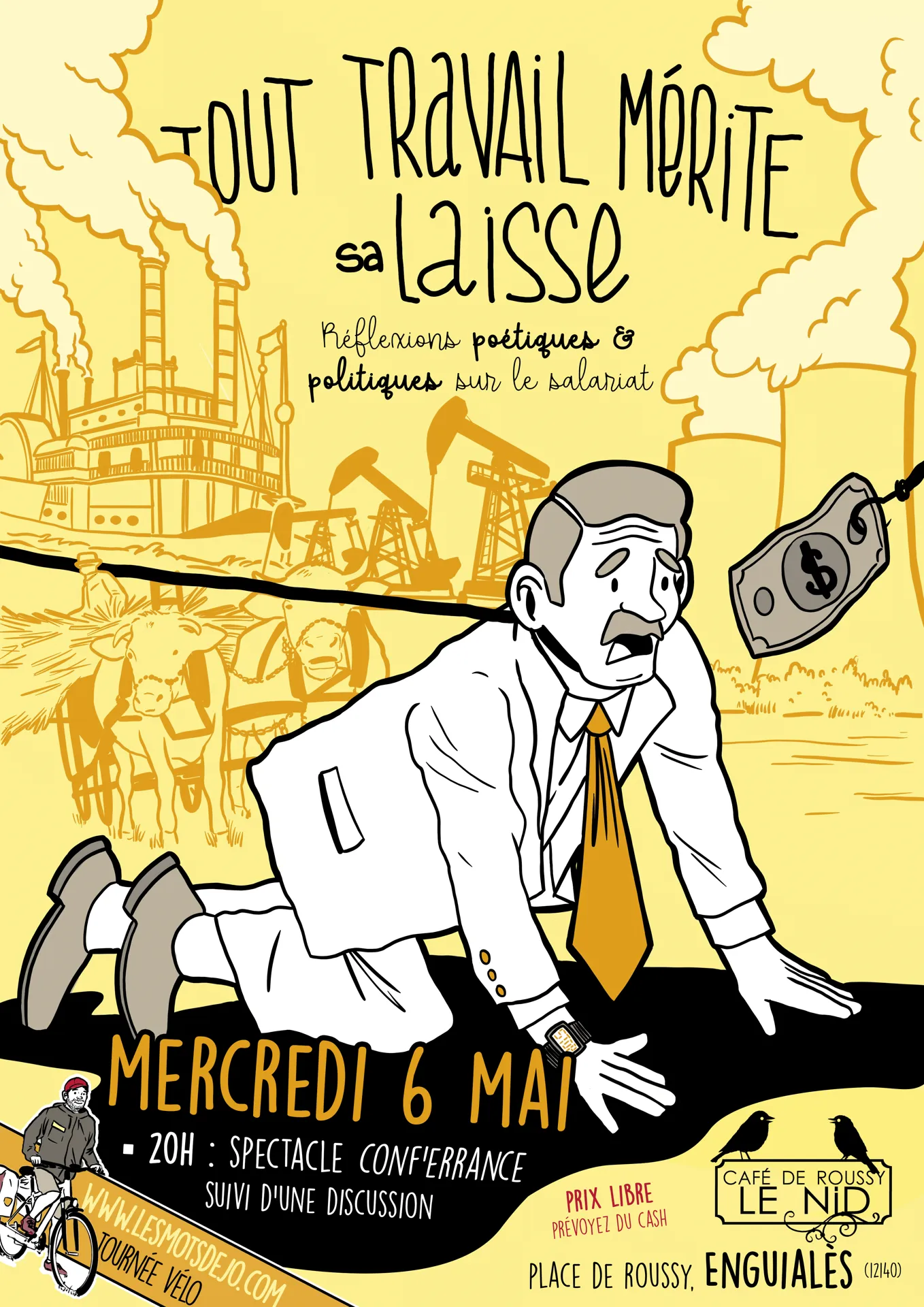 Réflexions poétiques et politiques sur le salariat avec Mojo. Suivi d’une discussion. Buvette et restauration du place